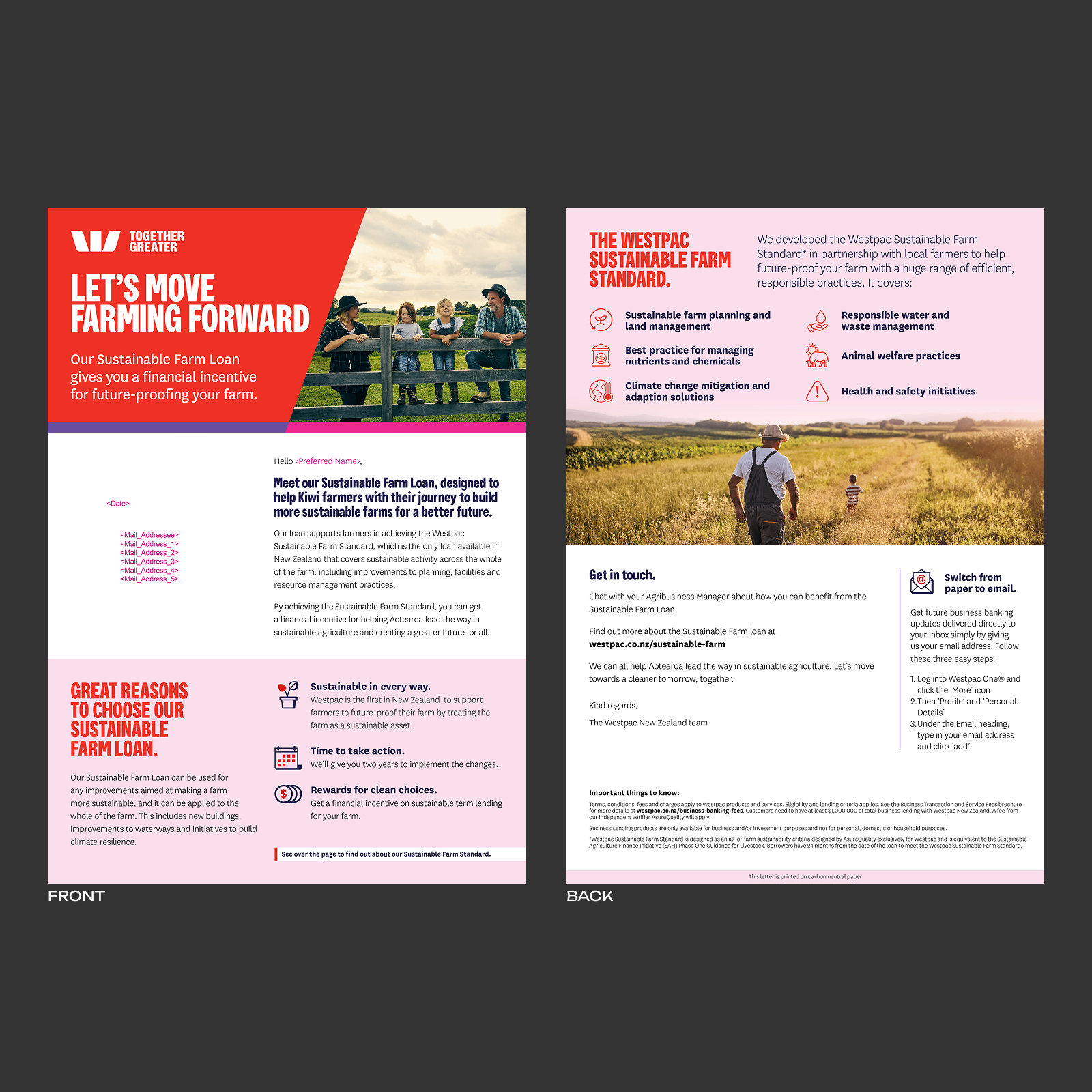 We created a flyer that balanced visual impact with clarity, breaking down the certification across environmental, social and governance factors. The design combined distinctly New Zealand photography with bold use of Westpac’s red, ensuring the work felt both local and attention-grabbing.