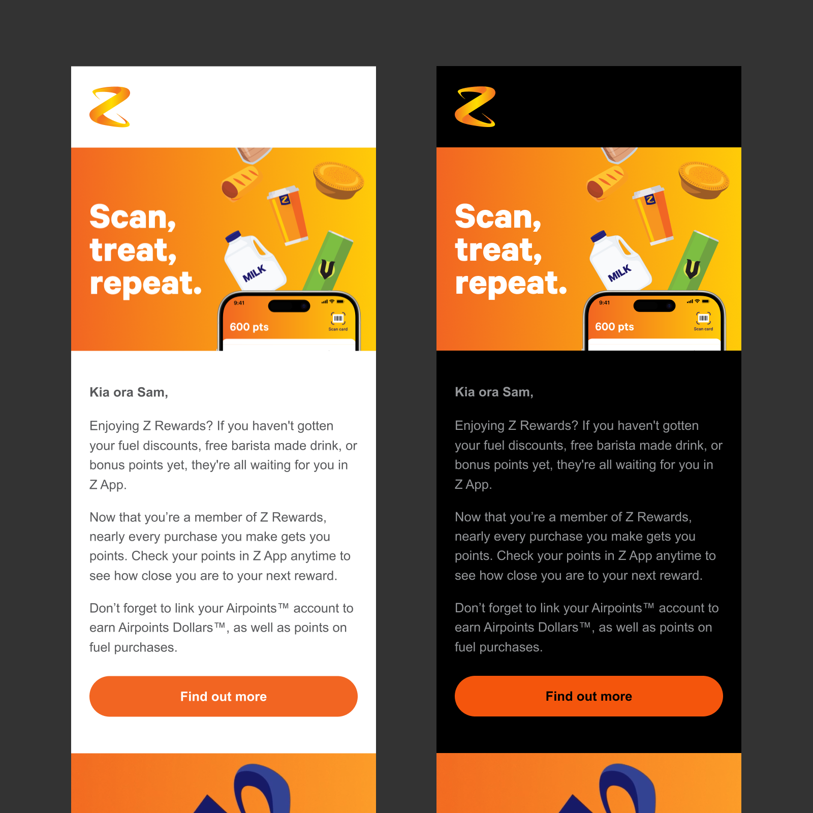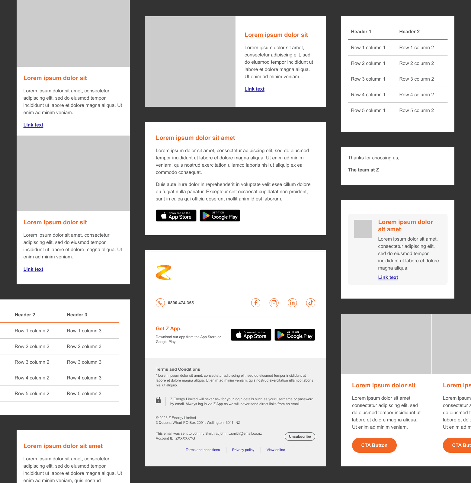 Z Energy’s existing SFMC email templates were no longer fit for purpose, so we were tasked with creating a new system that felt more modern and considered, while also acting as a scalable foundation for all future consumer email communications.